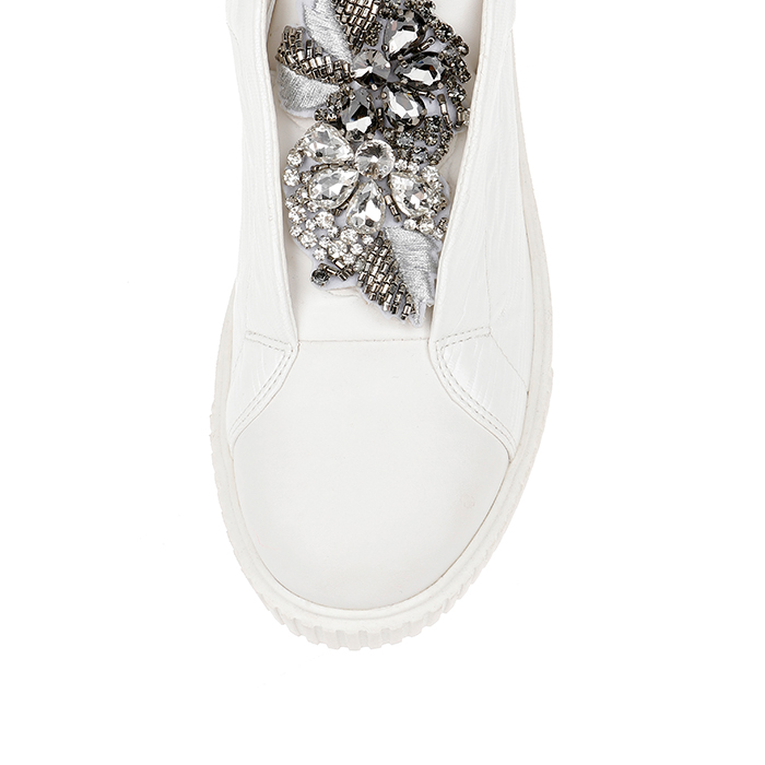 The Allie White Lace Up is a contemporary sneaker featuring exquisite pearl stone decorations and a synthetic leather upper with integrated elastic panels for enhanced fit and comfort.