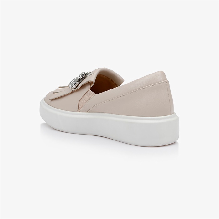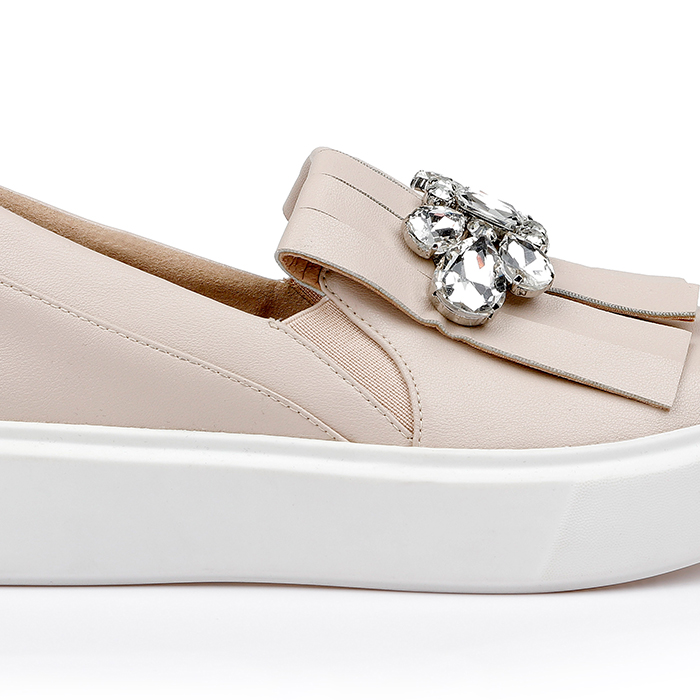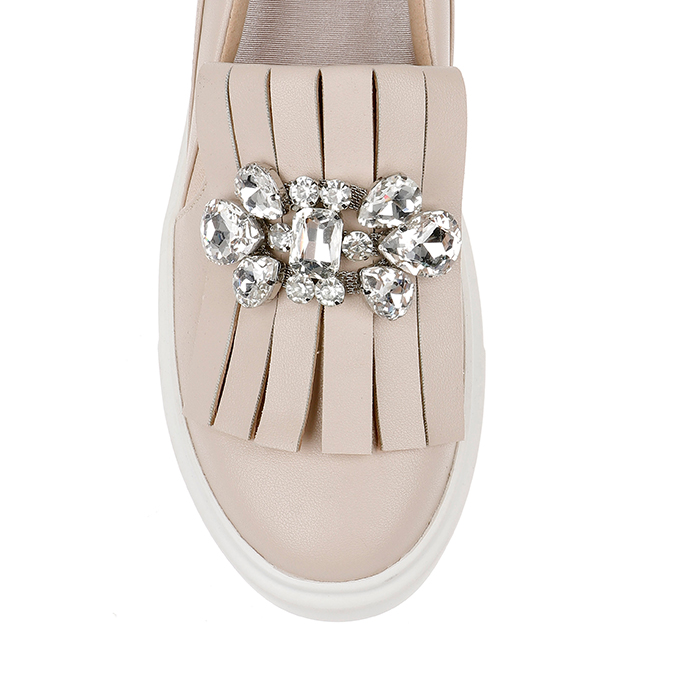 The Aria Beige Slip On is a contemporary sneaker featuring a sophisticated beige synthetic leather upper enhanced with distinctive crystal texture detailing and stone tassel embellishments for elevated everyday wear.