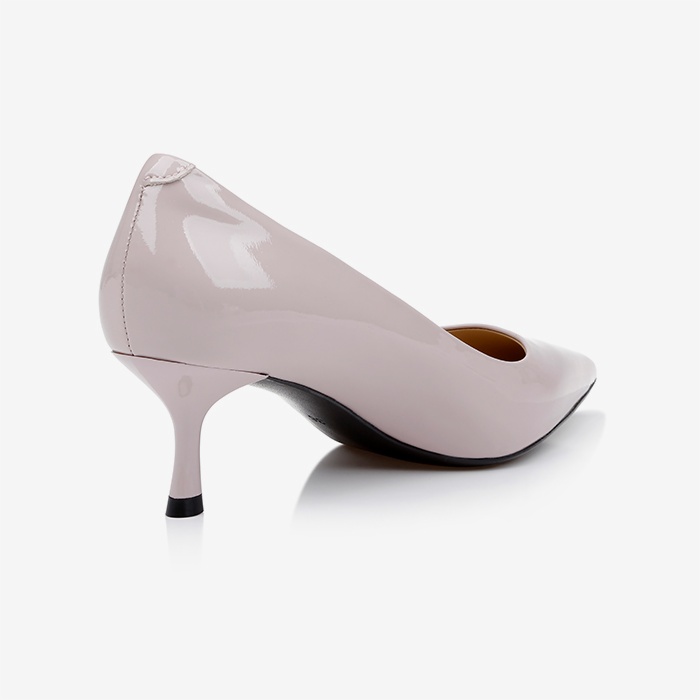 Baby pink patent leather pump featuring a pointed toe silhouette and kitten heel construction. Clean, minimalist design with high-gloss patent finish creates versatile appeal for contemporary collections.