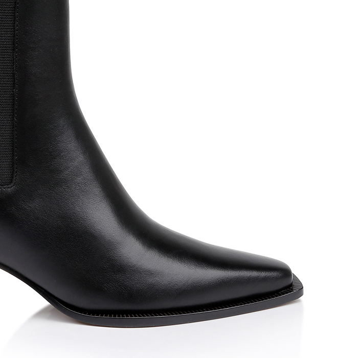 Upper construction utilizes premium cow leather with integrated elastic side panels for secure fit. German-manufactured sole paired with leather stacked heel provides 1.97″ (50mm) elevation. Low-profile ankle height offers streamlined aesthetic.