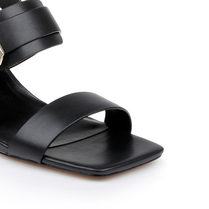 Leather square-toe mid-heel sandal with crisscross strap design, blending sophistication and comfort…