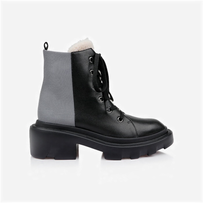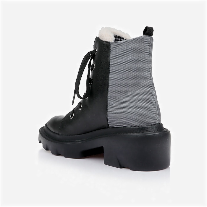 Lace-up ankle boot featuring black cow leather construction with silver fabric accent panels for distinctive color contrast. Synthetic fur-lined tongue and interior provide insulation for cold-weather performance.