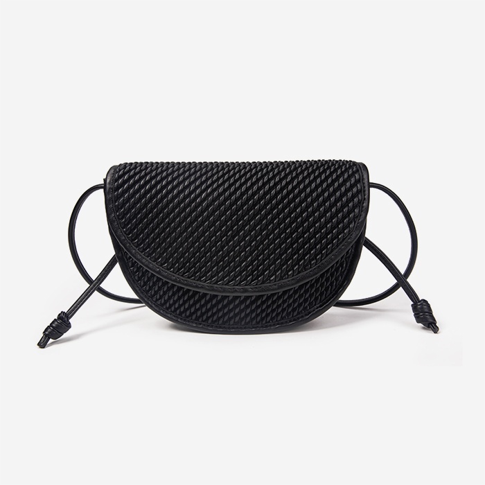 Half-circle crossbody bag featuring embossed woven pattern texture and slender adjustable strap. Contemporary silhouette delivers sophisticated styling with lightweight construction for everyday versatility.
