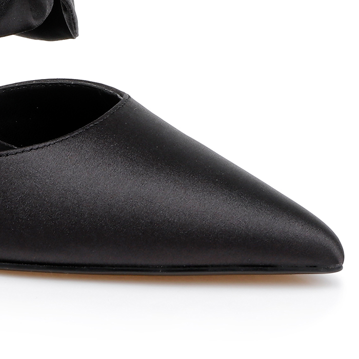 Luxe satin fabric upper with matching self-covered satin heel treatment. Heel height measures 3.38″ (86mm) for dramatic elevation. Pointed toe construction creates elongated foot profile with refined finishing.