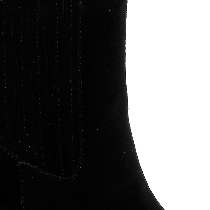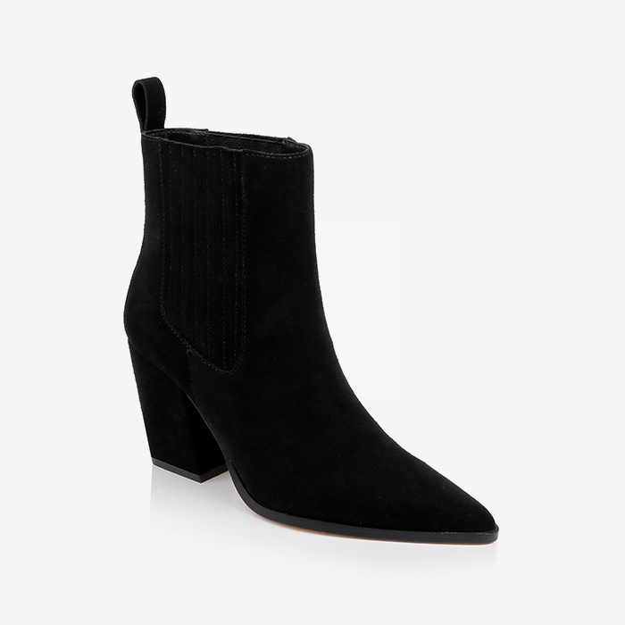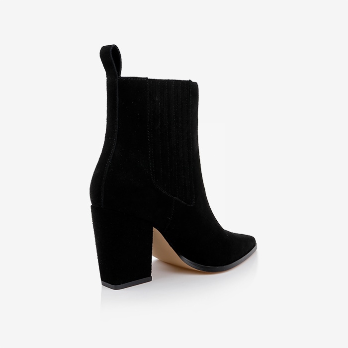 High ankle boot featuring cow suede upper construction with self leather heel detail. Clean silhouette designed for all-day comfort and stability.