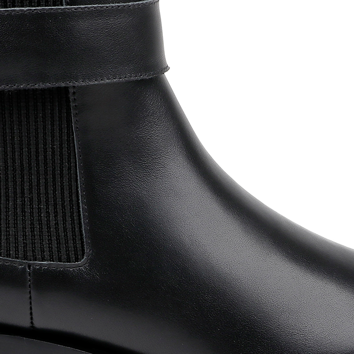 Premium box leather upper with leather stacked heel construction. 3.15″ (80mm) heel height provides elevated profile while maintaining comfort. Elastic shaft integration ensures consistent fit across size range.