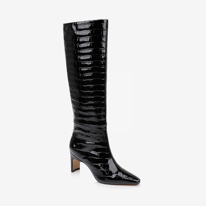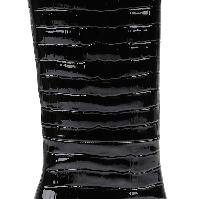 Upper constructed from patent cow leather with crocodile emboss texture. Self leather heel measures 2.75″ (70mm) for comfortable elevation. Boot height extends to mid-knee for extended coverage.
