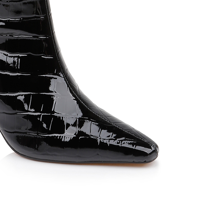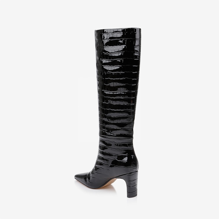 Mid-height knee boot featuring patent crocodile-embossed cow leather upper with high-gloss mirror finish. Self leather heel construction provides seamless aesthetic integration.