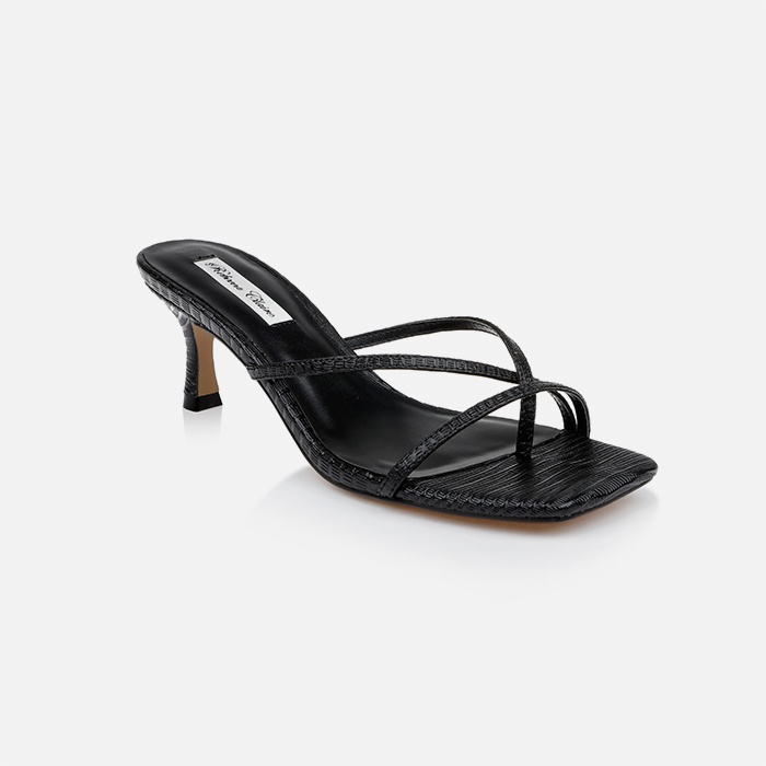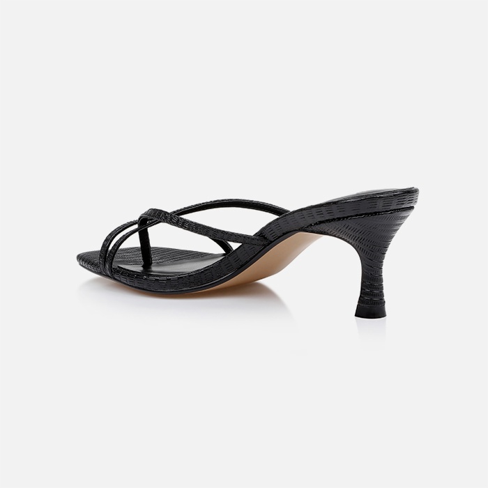 Constructed from genuine kid leather with embossed lizard print finish. Features 2.36″ (60mm) heel height for comfortable elevation. Cross strap upper provides secure fit while maintaining clean aesthetic lines.
