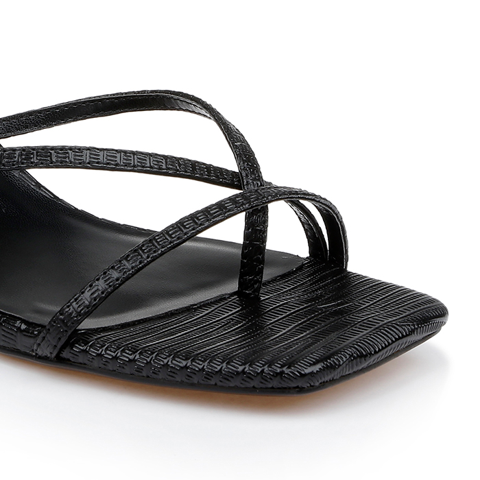 Square-toe leather sandal featuring distinctive lizard-print texture with cross strap upper design. Minimalist silhouette combines contemporary square toe styling with elegant thin strap construction for sophisticated appeal.