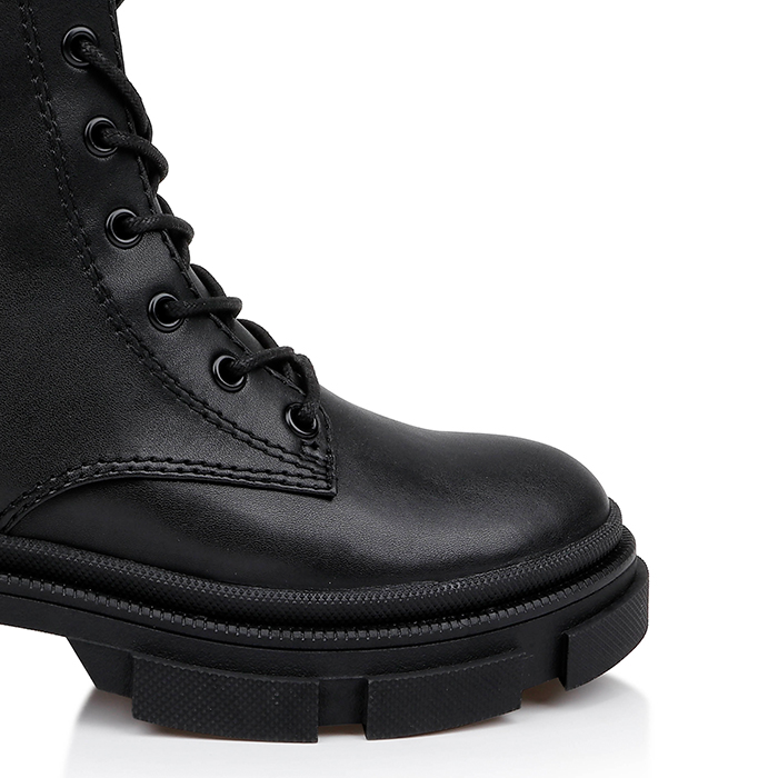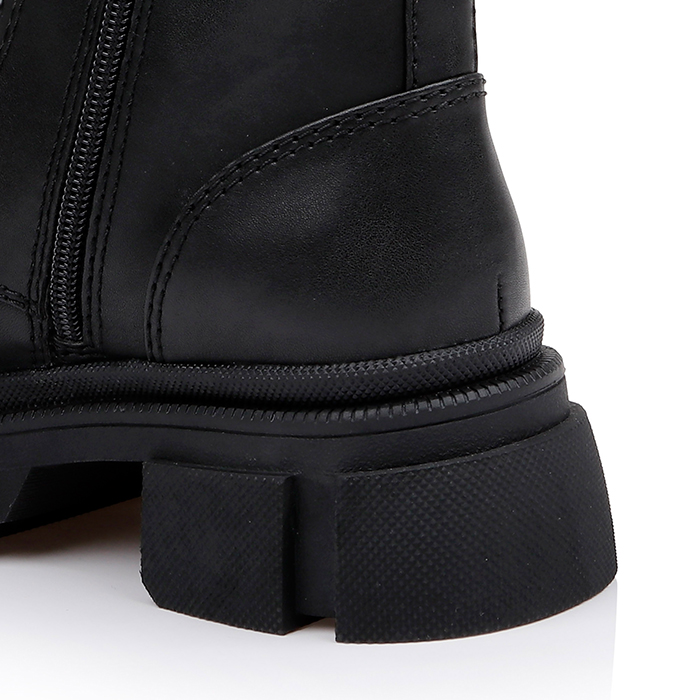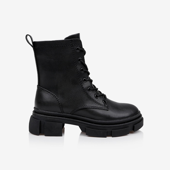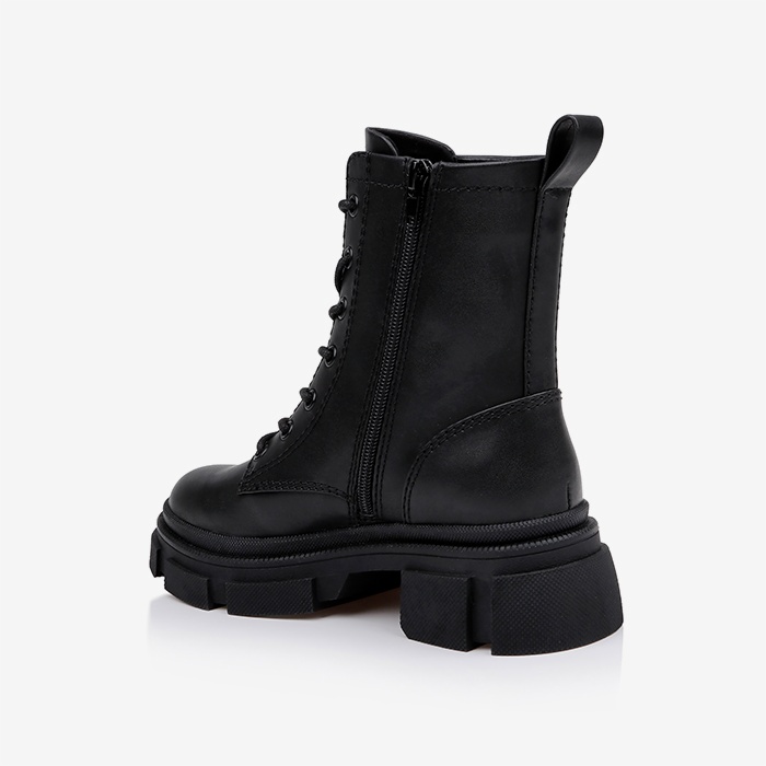 Black synthetic leather ankle boots featuring lace-up closure and oversized rubber outsole design for extended wear comfort. Contemporary silhouette combines urban styling with functional construction details.