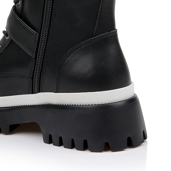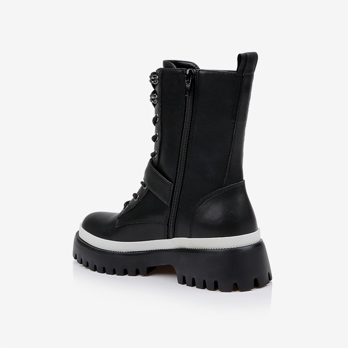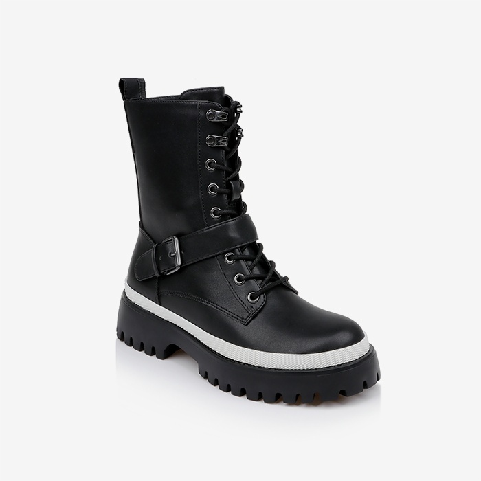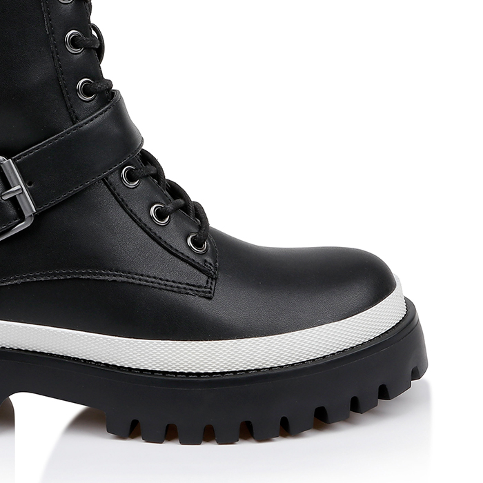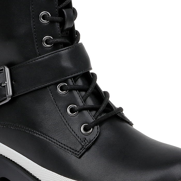 High ankle boot with hiking-inspired design combining lace-up closure system and decorative strap elements. Features synthetic leather upper construction with white contrast foxing detail and buckle ornament accents.