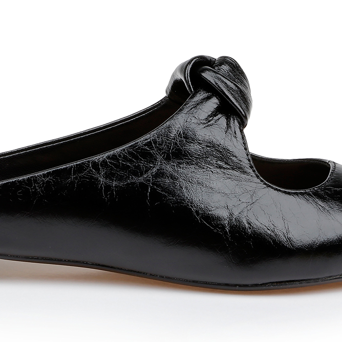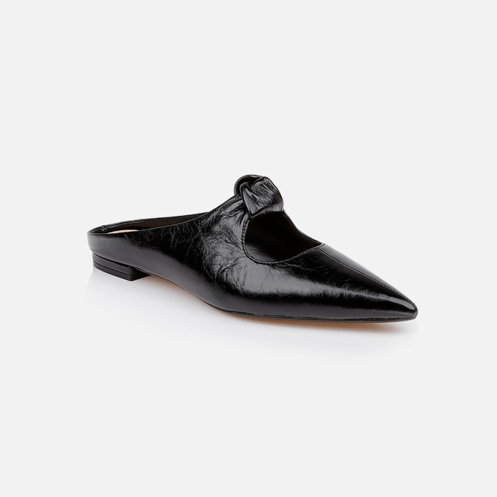 Pointed-toe flat sandal in premium wrinkle patent kid leather featuring an open-back mule construction with decorative bow detail positioned on the instep for refined feminine appeal.