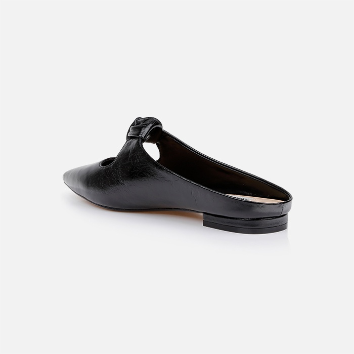 Wrinkled leather pointed-toe flat sandal with an open back, featuring a bow…