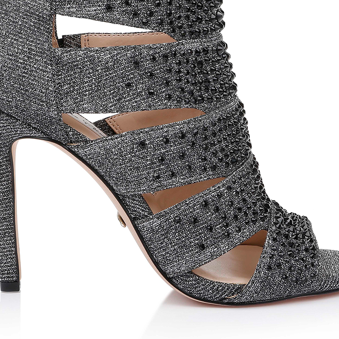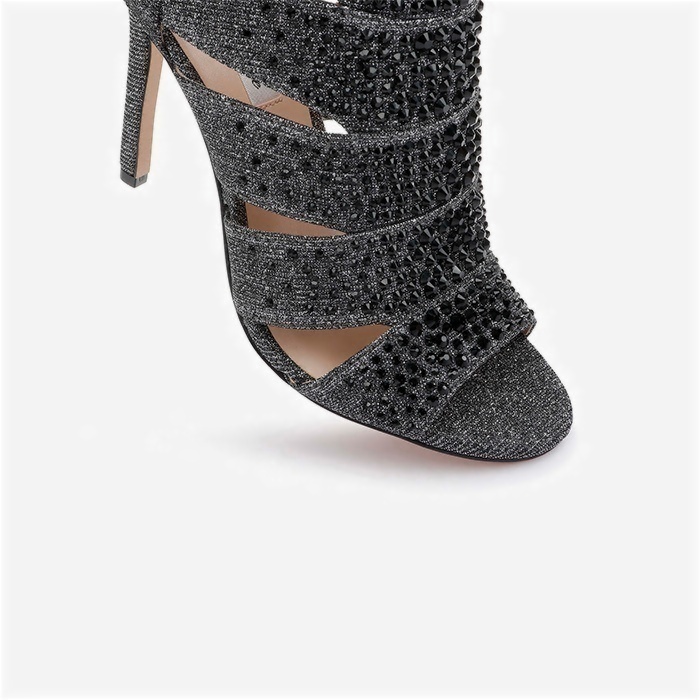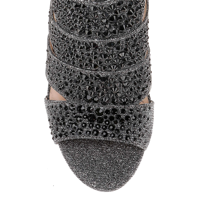 Ultra-high 3.94″ (100mm) stiletto heel construction with shiny textile upper material. Full stone decoration treatment across upper provides enhanced visual impact and texture variation.