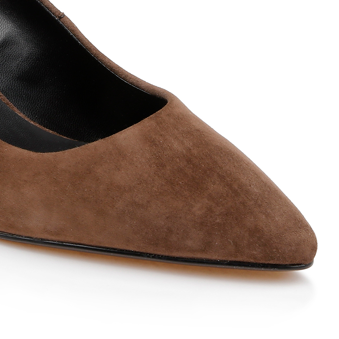 Premium kid suede upper construction with matching leather lining. Block heel measures 2.67″ (68mm) in height with self-covered kid suede finish. Almond toe shape provides comfortable fit while maintaining sleek aesthetic.