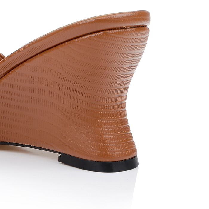 Crafted from genuine leather with lizard embossing treatment. Features self-color synthetic heel wrap for durability and aesthetic continuity. Wedge construction offers stability and comfort for extended wear.