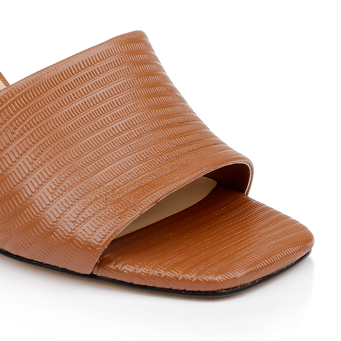 Square-toe wedge sandals featuring lizard-embossed leather uppers with sophisticated textural detailing. One-piece upper construction creates clean lines while the mid-height wedge provides comfortable elevation for contemporary styling.