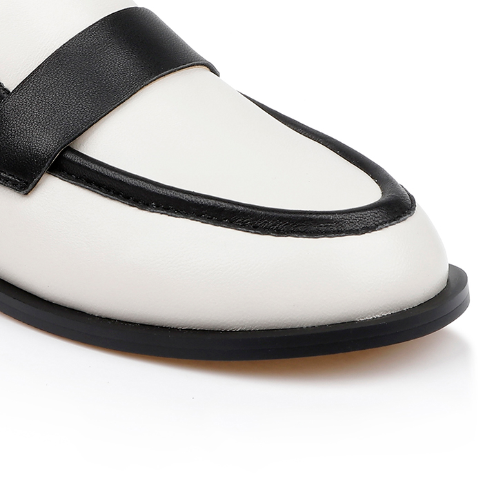 Round toe loafer featuring contrasting two-tone kid leather upper construction. Clean silhouette with refined proportions suitable for contemporary casual and smart-casual collections.