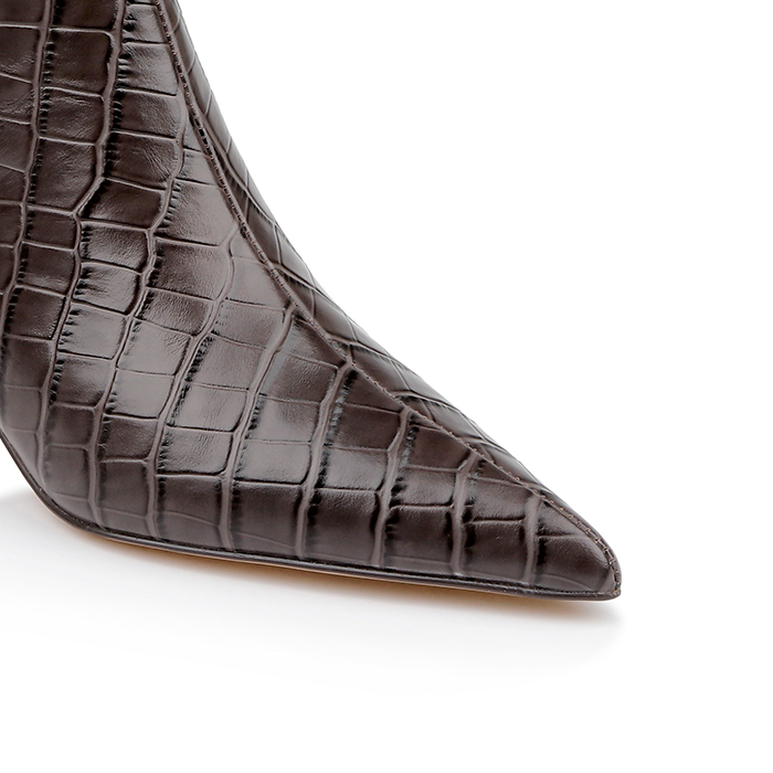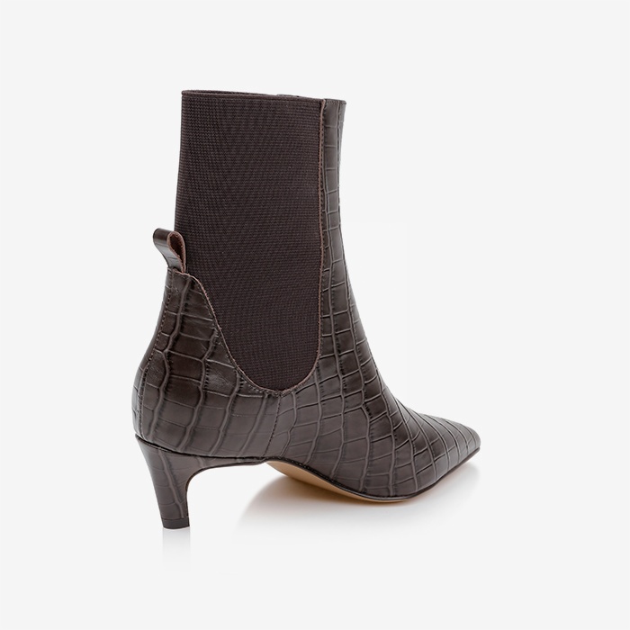 Women’s Chelsea ankle boot featuring a refined silhouette with feminine proportions. Croc-embossed cow leather upper delivers sophisticated texture while maintaining the classic Chelsea boot aesthetic with elastic side panels.