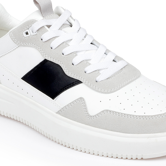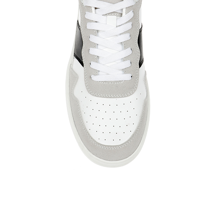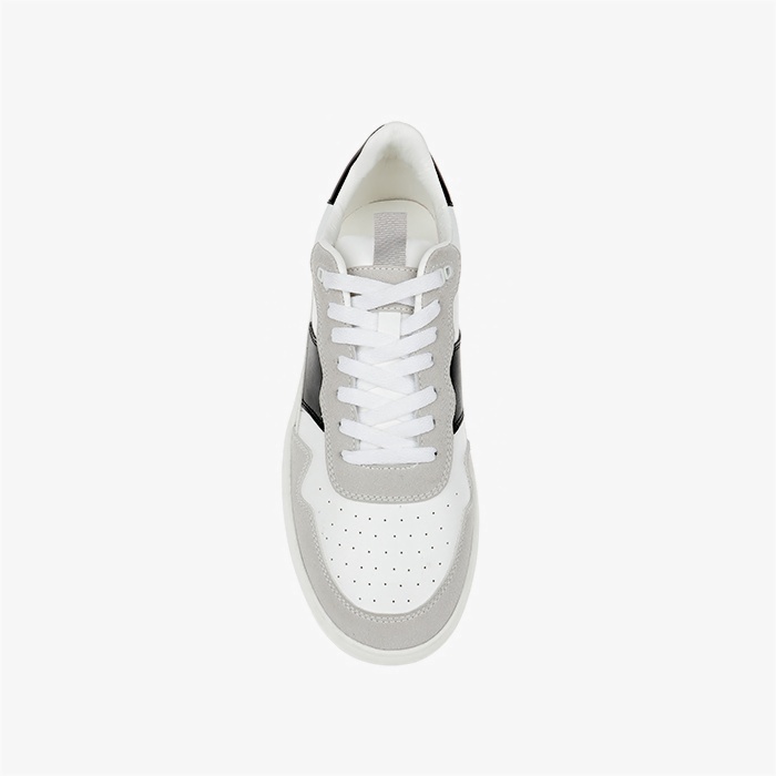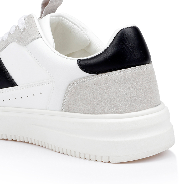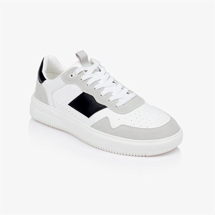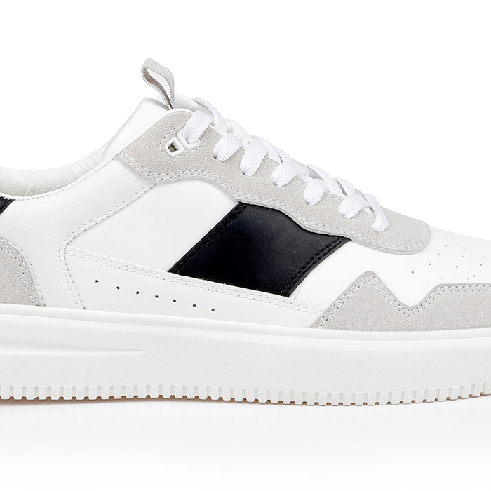 The Ethan White Grey Basketball sneaker features a synthetic leather and suede upper construction with distinctive toothed TPU sole edging for enhanced court traction and visual appeal.