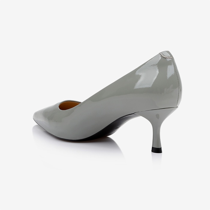Middle heel patent leather pump featuring a sharp pointed toe silhouette and sleek kitten heel design. The glossy patent finish delivers sophisticated appeal for professional and formal applications.
