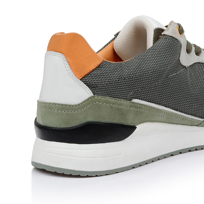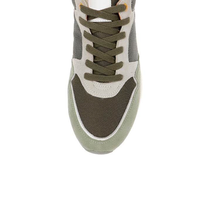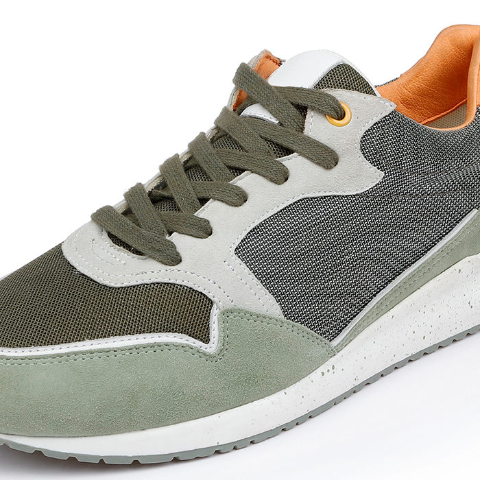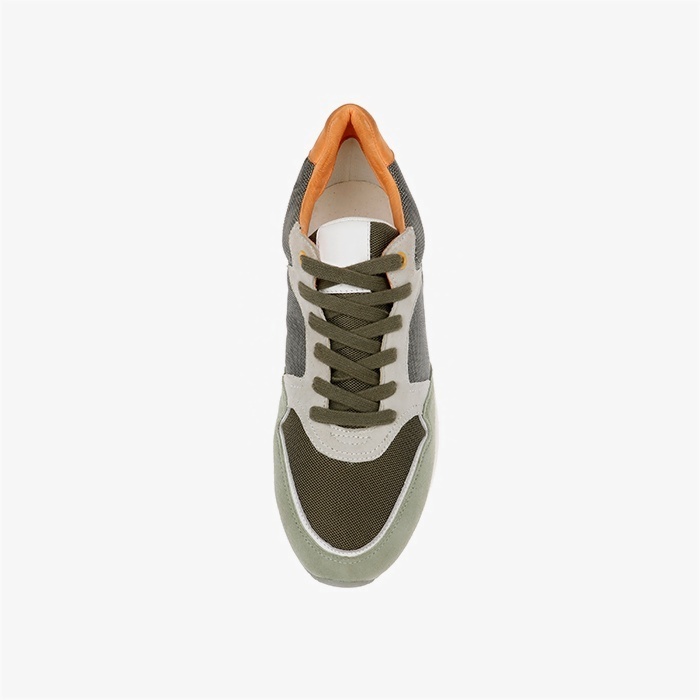 The Liam Khaki NB Running is a retro-inspired athletic sneaker featuring vintage khaki tones with sophisticated texture contrasts. The design combines a soft suede upper with distinctive brown collar detailing for authentic vintage appeal.