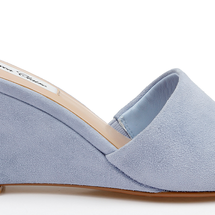 Mid-height wedge heel with self-color synthetic heel wrap provides stability and clean aesthetic lines. Kid suede upper offers soft hand-feel and natural texture variation. Square toe silhouette delivers on-trend geometric styling.