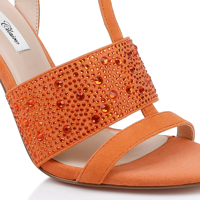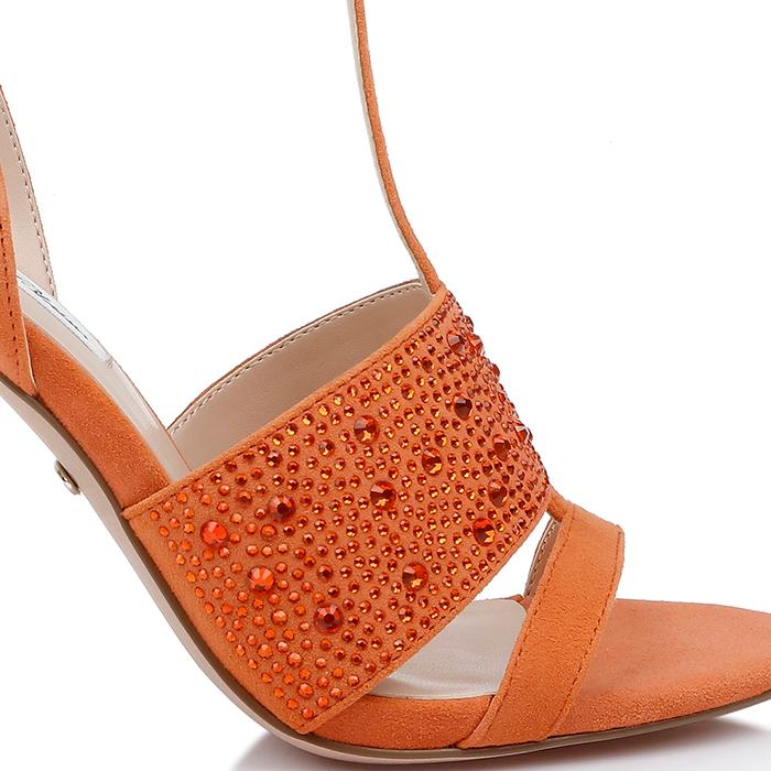 Ultra-high stiletto sandal featuring suede strap construction with glamorous hotfix stone detailing. Round-toe silhouette with ankle strap and buckle closure delivers secure fit and contemporary appeal for evening and special occasion wear.