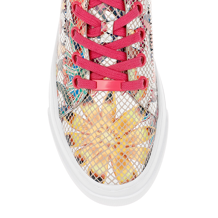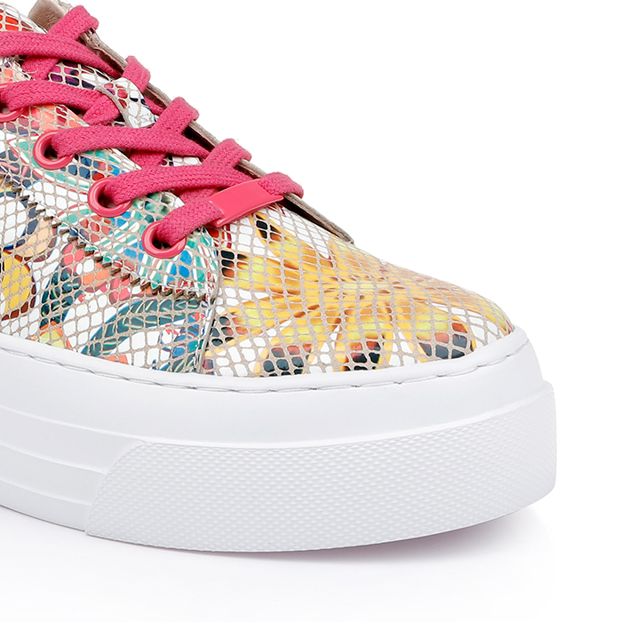 Multi-material leather sneaker featuring bold tropical floral print construction with contrasting pink lace details. Design combines genuine cow leather upper with strategic leather panels for enhanced durability and style differentiation.