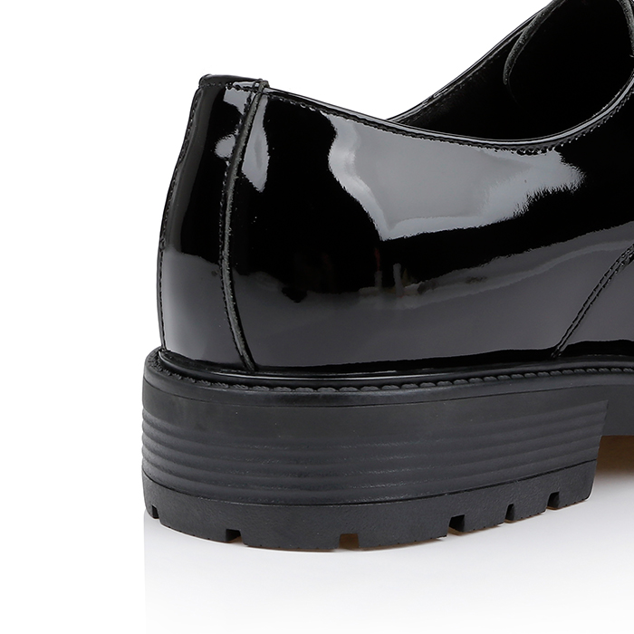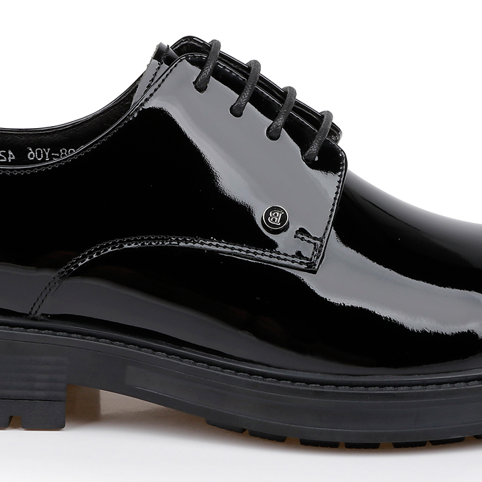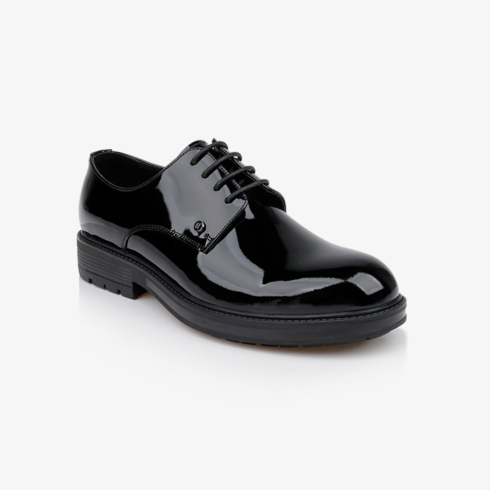 Constructed with genuine patent cow leather upper for durability and shine retention. Features molded rubber outsole construction that provides reliable traction and long-wearing performance. Standard dress shoe last accommodates professional sizing requirements.