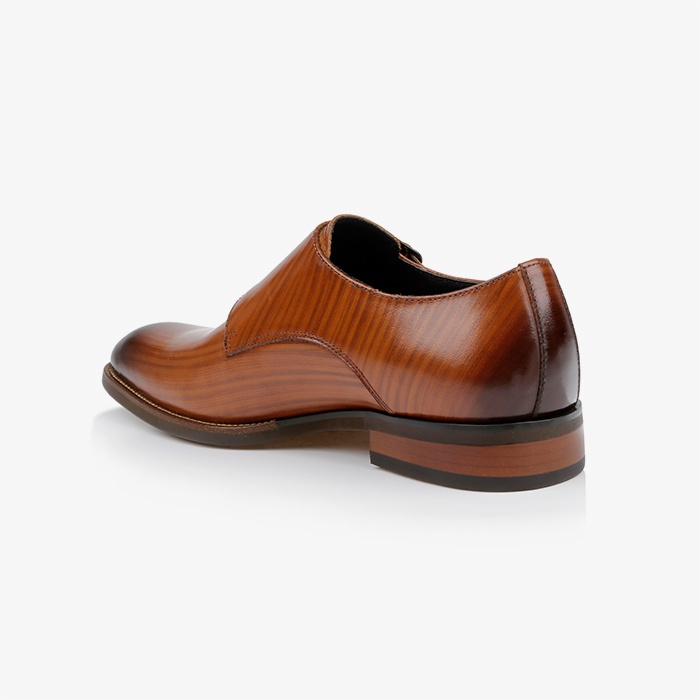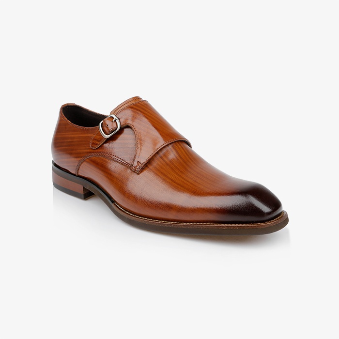 The Reed is a sophisticated men’s dress shoe featuring a classic monk strap design crafted from premium printed burnished cow leather. The upper showcases distinctive burnishing techniques that enhance the natural leather grain patterns.