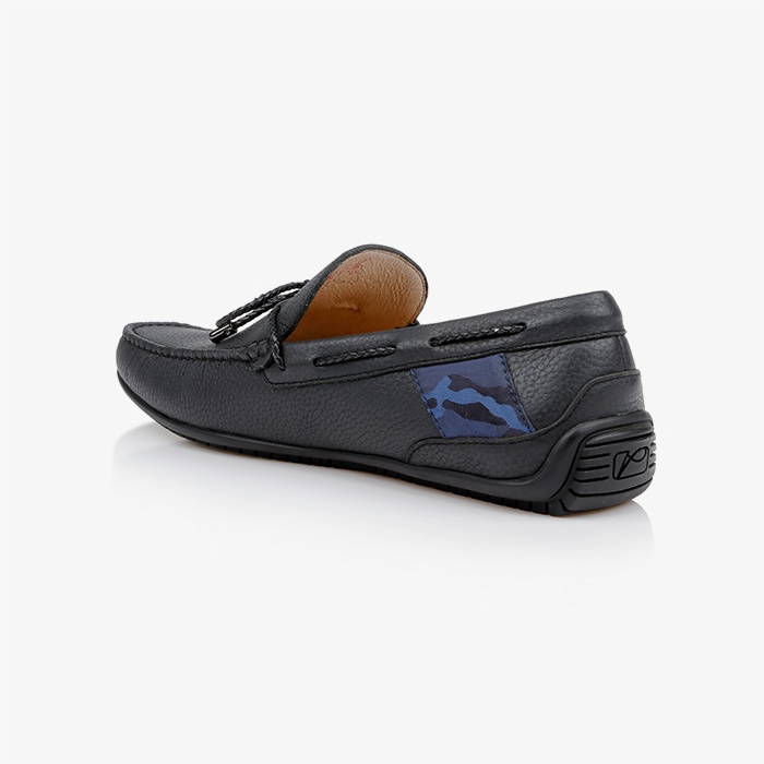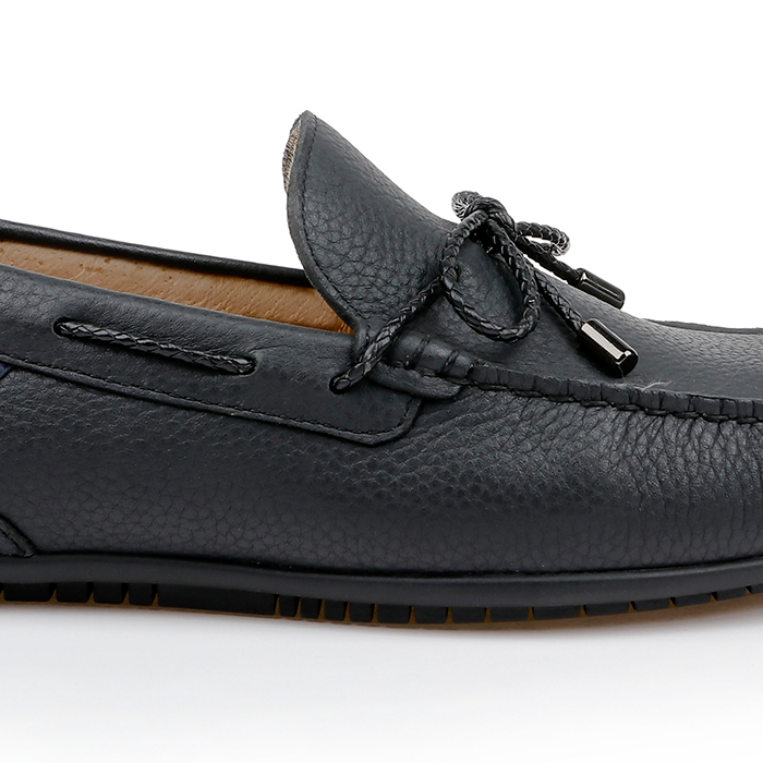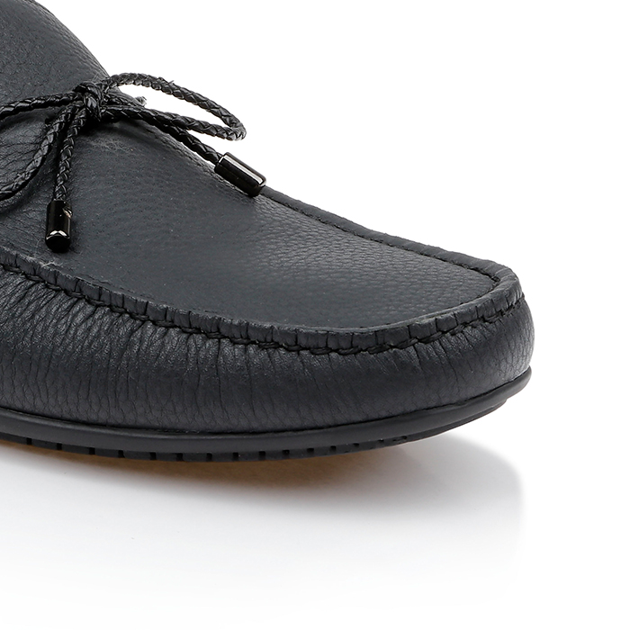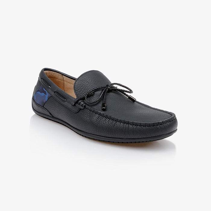 The Ronan is a men’s driving shoe featuring a tumbled cow leather upper with distinctive braided leather lacing for enhanced visual texture and durability. The construction emphasizes comfort and flexibility for extended wear.