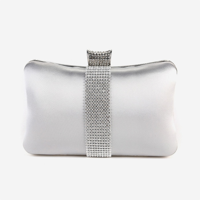Hard-case evening clutch featuring silver satin construction with rhinestone accent detailing. Structured silhouette designed for formal and evening occasions with secure closure mechanism.