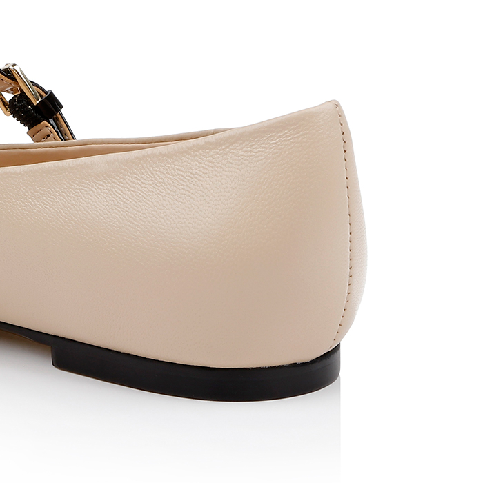 Mary Jane flat featuring contrasting patent leather toe piece against kid leather upper. Almond toe silhouette with adjustable strap closure for secure fit.