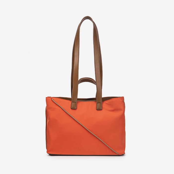 The Tangerine Tote features a contemporary color-block design with dual reinforced handles for reliable everyday carry. Clean lines and bold accent panels deliver modern aesthetic appeal for retail collections.