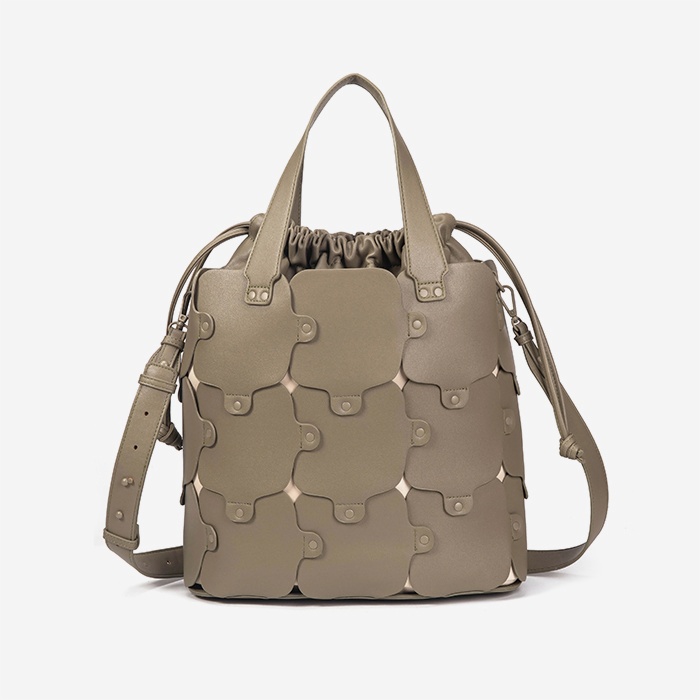 Versatile bucket bag featuring distinctive petal-inspired design elements with dual carrying options. Includes both top handle and adjustable shoulder strap for flexible styling and functionality.
