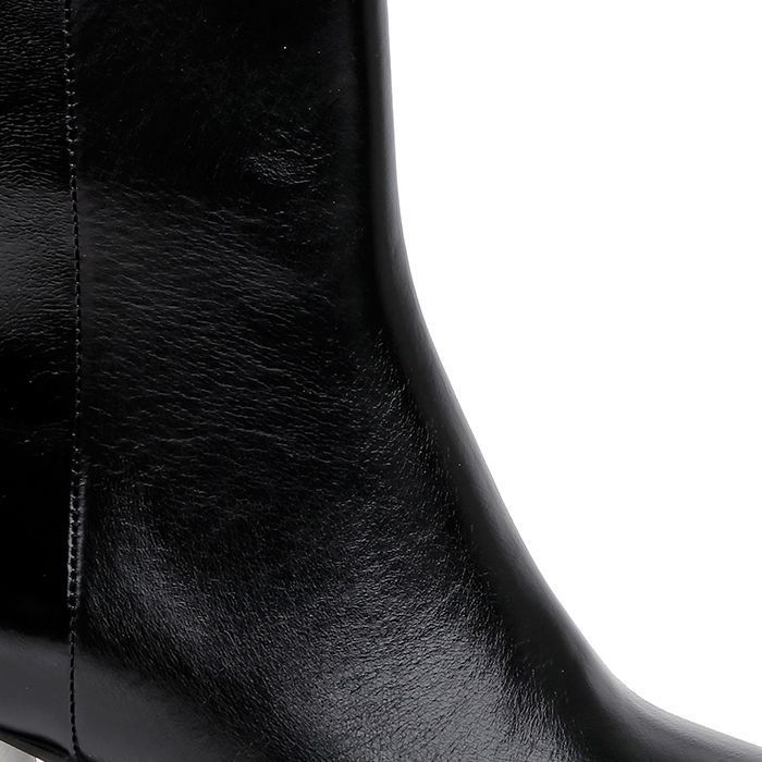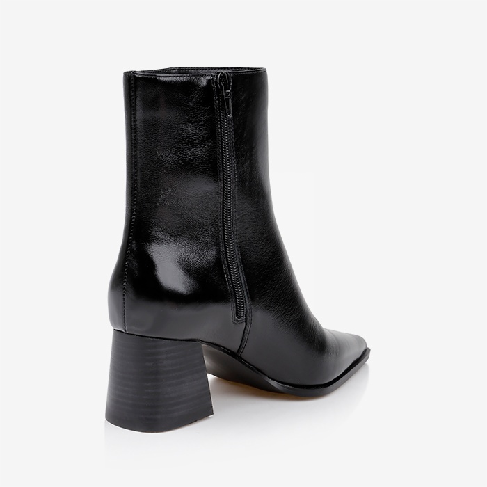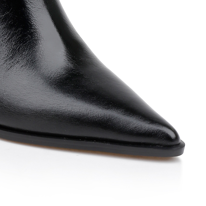 Cow leather upper with leather stacked heel construction. Mid-height ankle coverage with 2.28″ (58mm) heel height. Pointed toe shape creates sleek profile while substantial square heel provides stability and comfort.