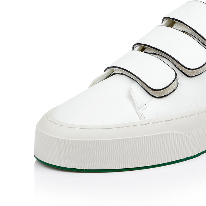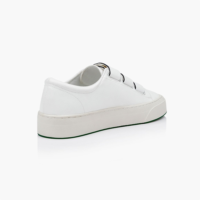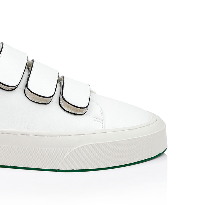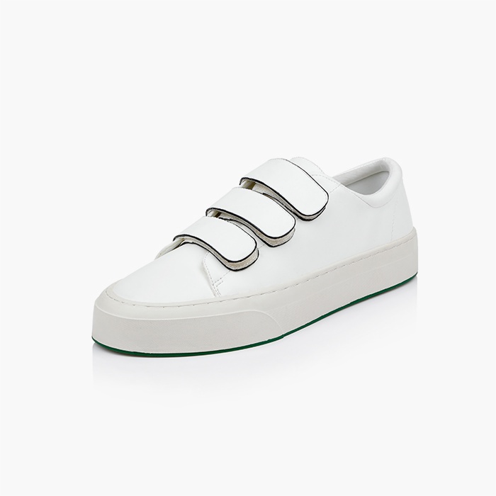Contemporary white synthetic leather sneaker featuring velcro fastening system for streamlined functionality and easy wear. Clean, minimalist design with modern athletic silhouette appeals to diverse consumer segments.