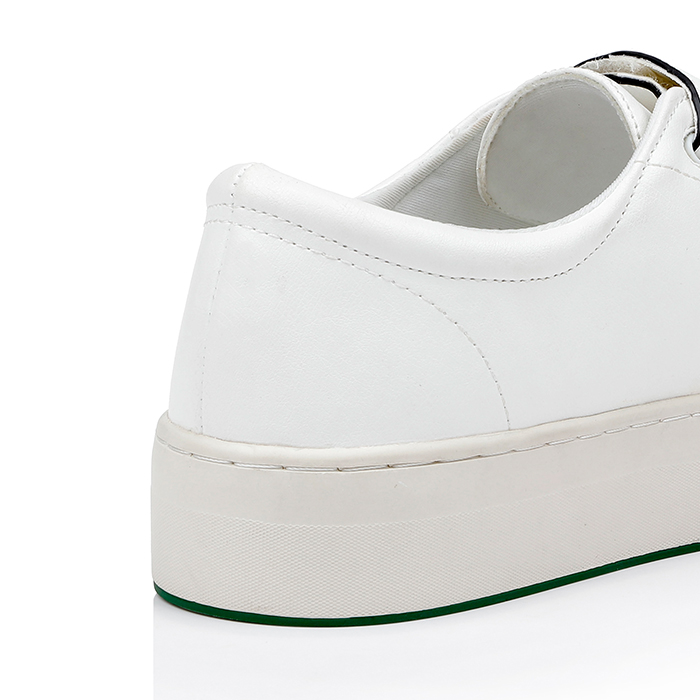All-white shoe with a navy tag on the tongue—a small but bold…